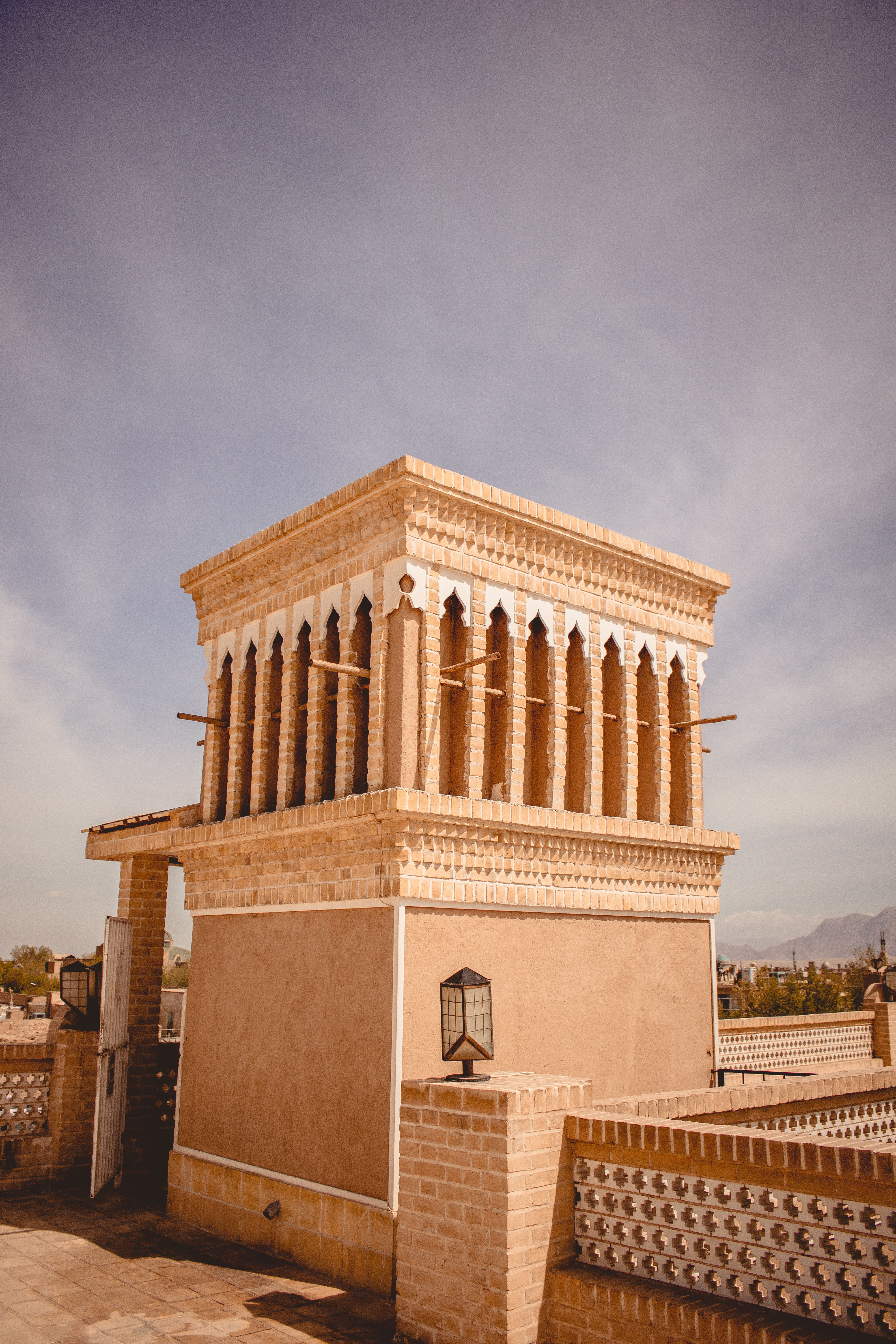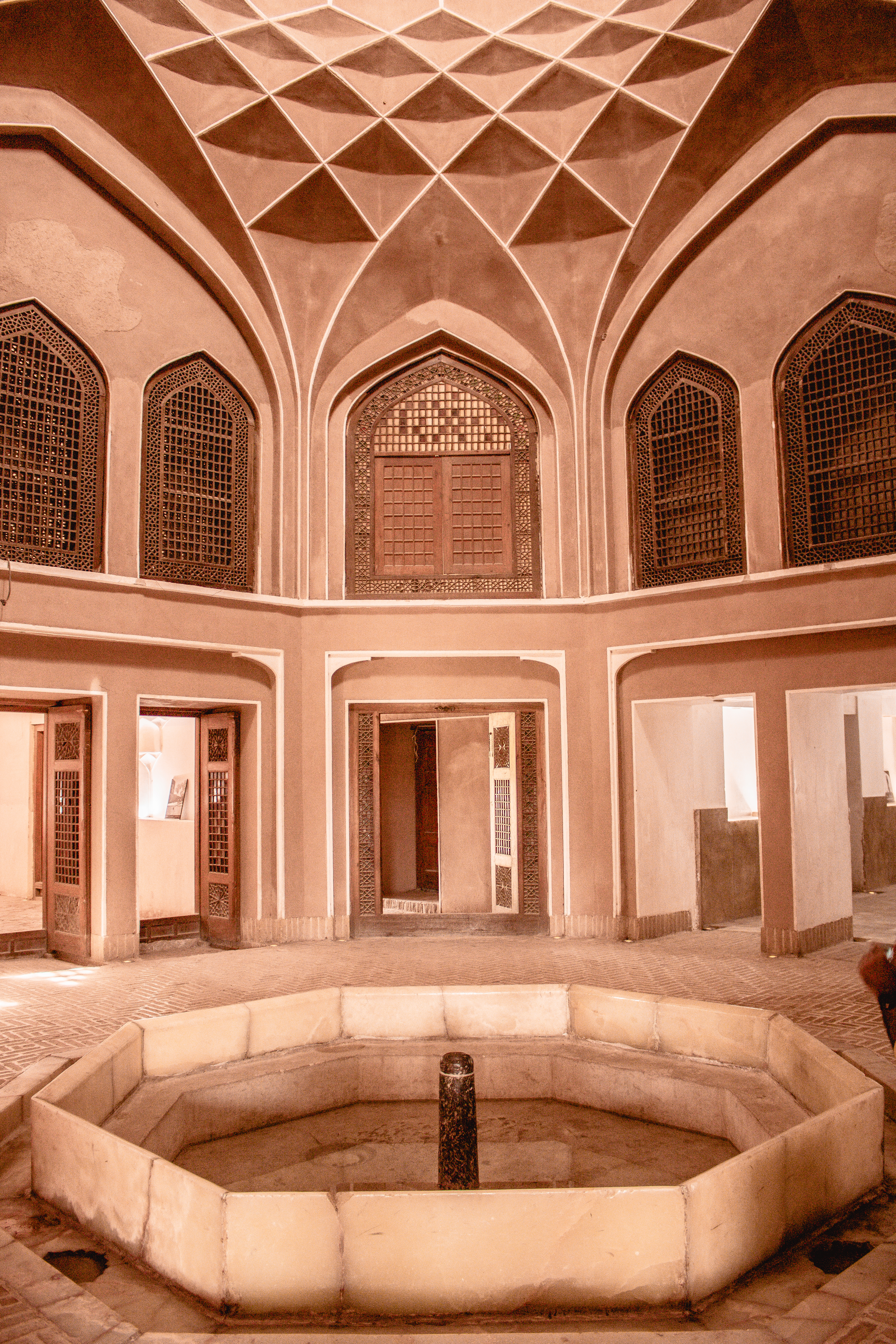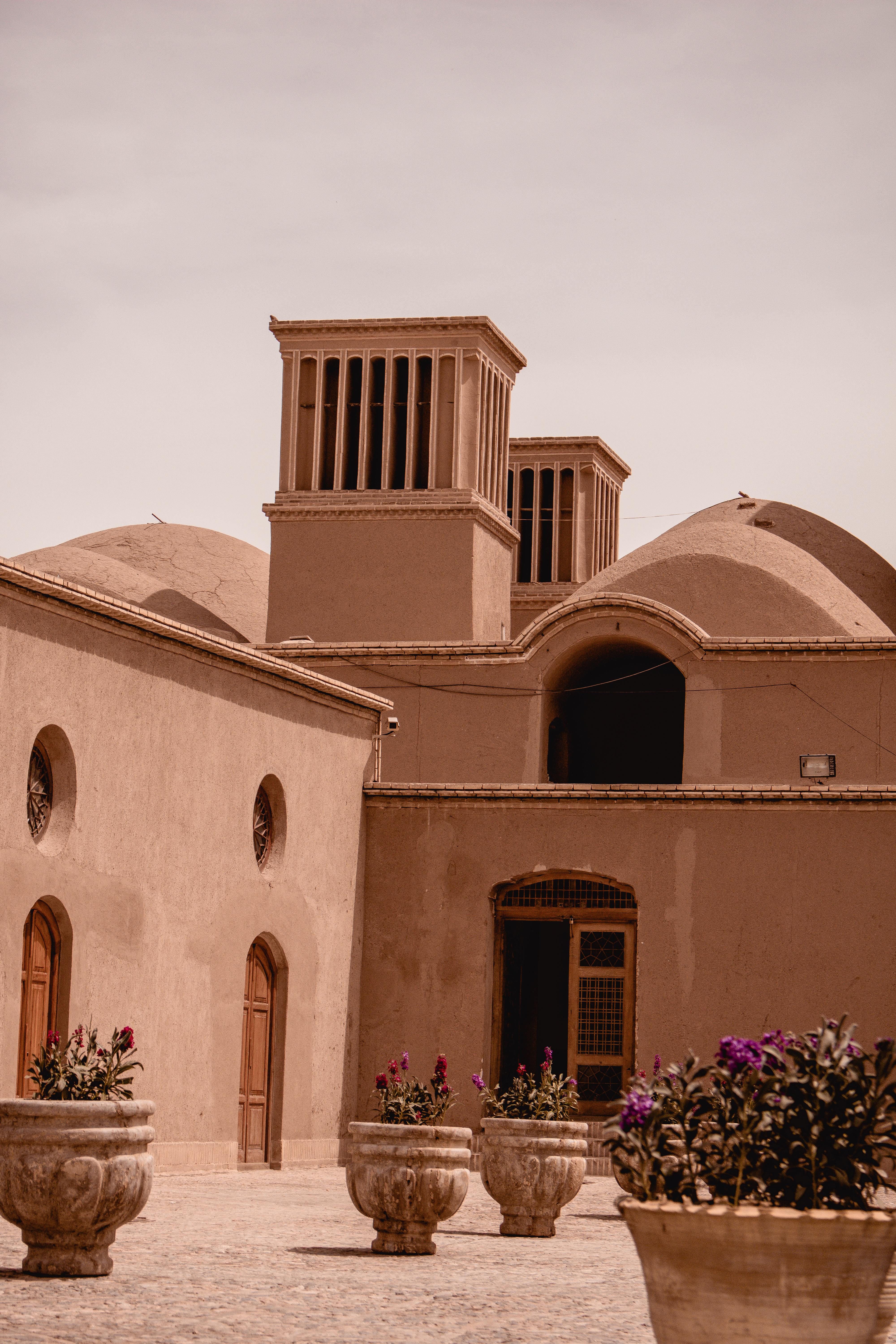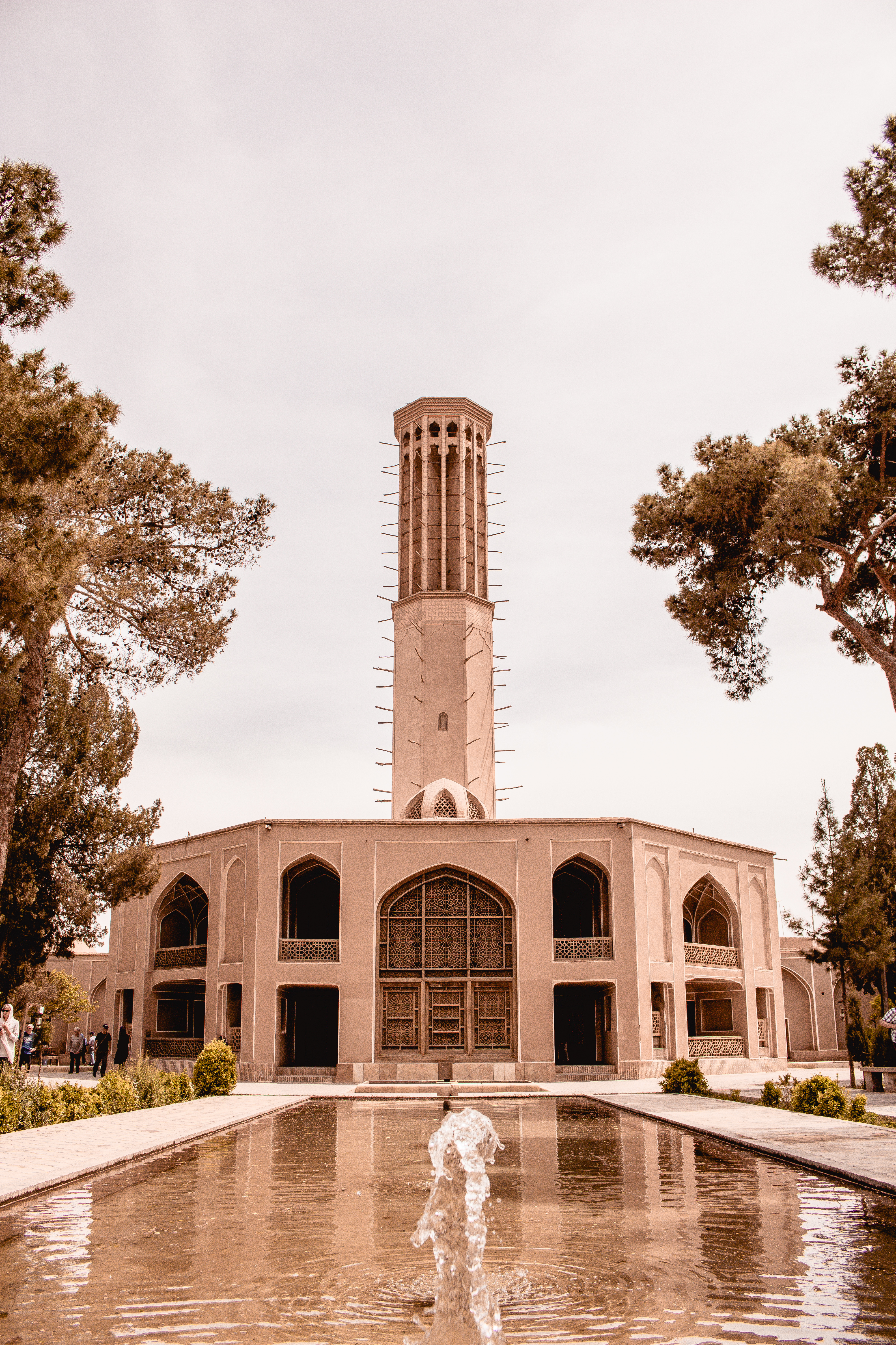 Yazd, thanks to the climate, needs LOTS of shade. It’s not uncommon for buildings to have large underground spaces to escape the summer desert heat. Walls are high and thick and the materials used are Adobe. Keeps the heat out. Another innovation that has helped these people are the ubiquitous bâdgir (wind catchers). These high towers direct the hot air down to a central room in the building, where a water body lends moisture and cool to it, before the air is spread across all rooms. We saw this system in action and the results are amazing.