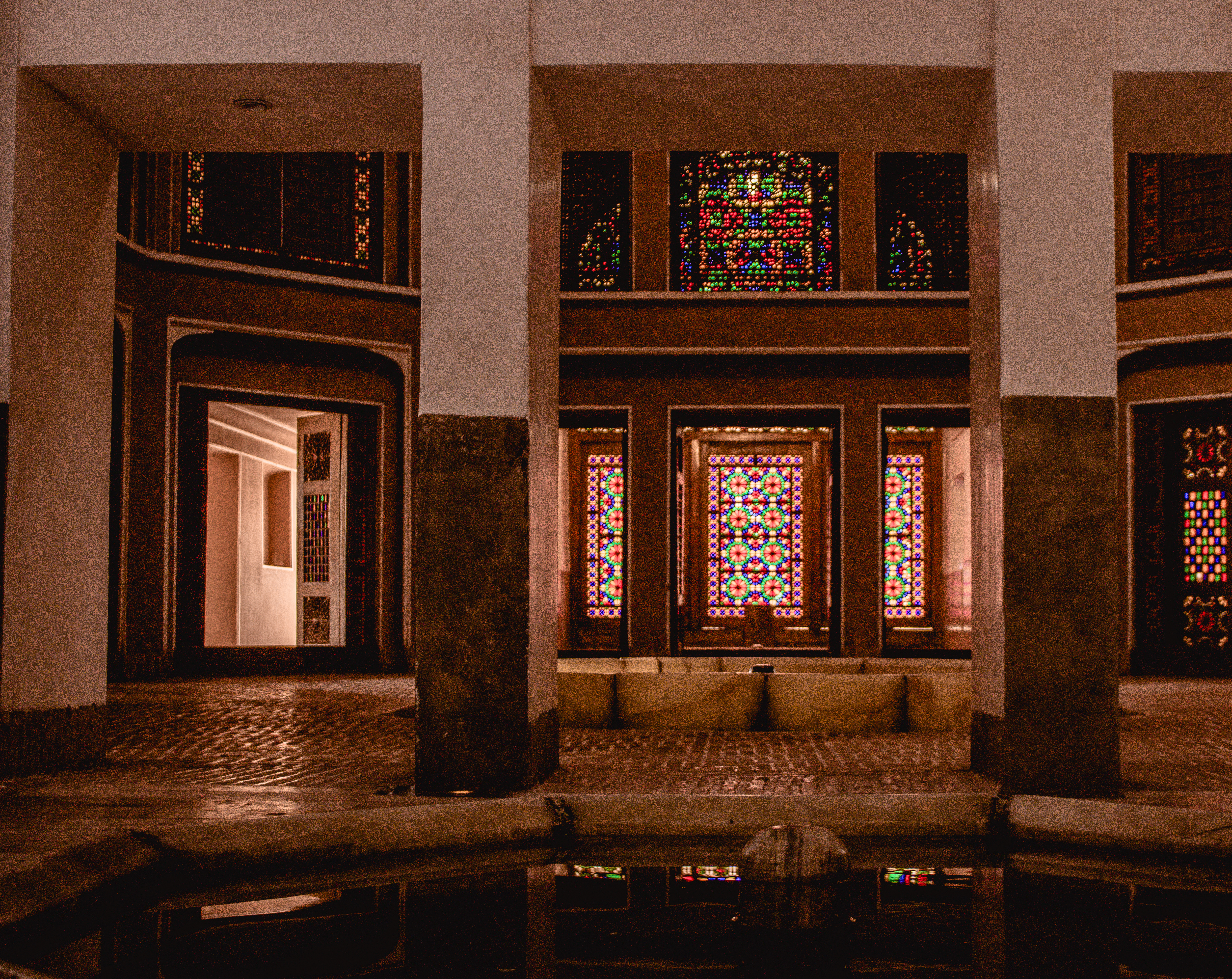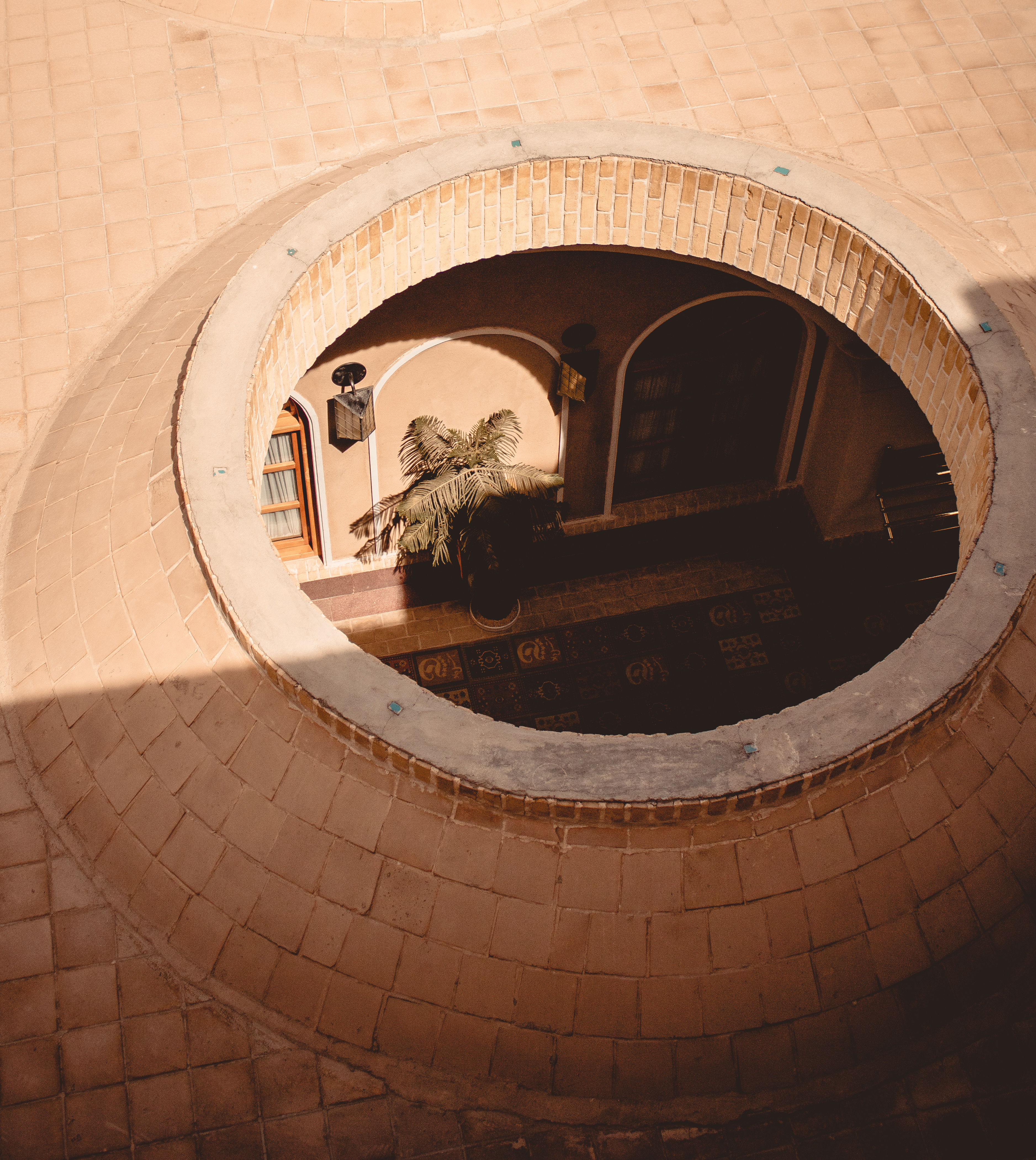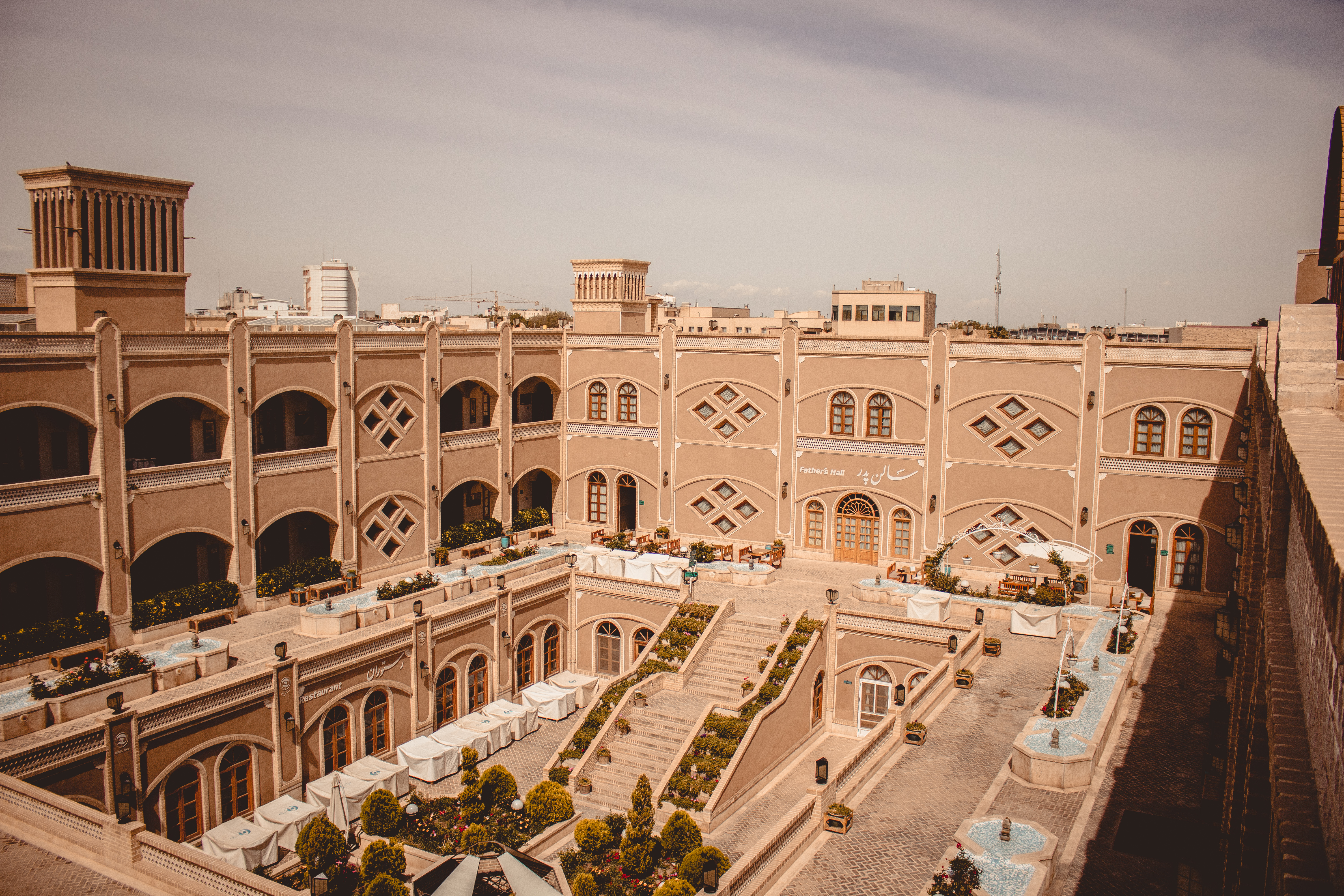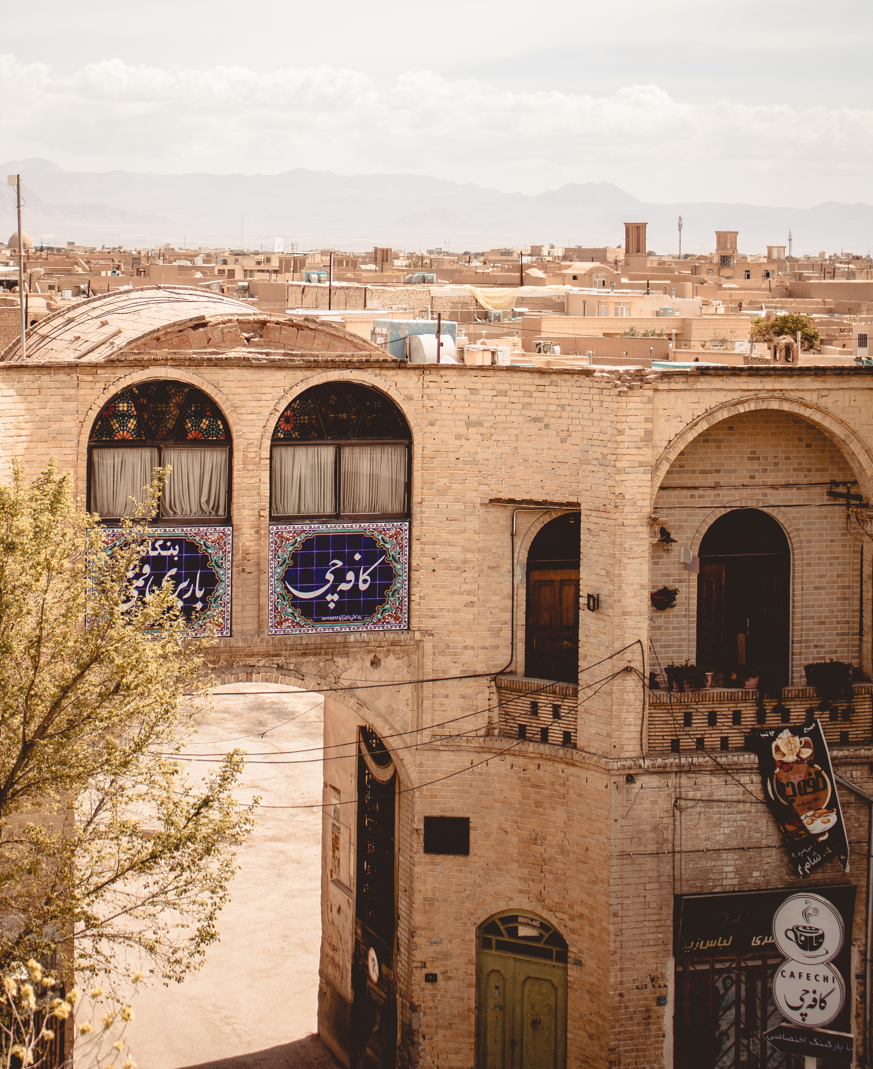 Yazd, thanks to the climate, needs LOTS of shade. It’s not uncommon for buildings to have large underground spaces to escape the summer desert heat. Walls are high and thick and the materials used are Adobe. Keeps the heat out. Another innovation that has helped these people are the ubiquitous bâdgir (wind catchers). These high towers direct the hot air down to a central room in the building, where a water body lends moisture and cool to it, before the air is spread across all rooms. We saw this system in action and the results are amazing.